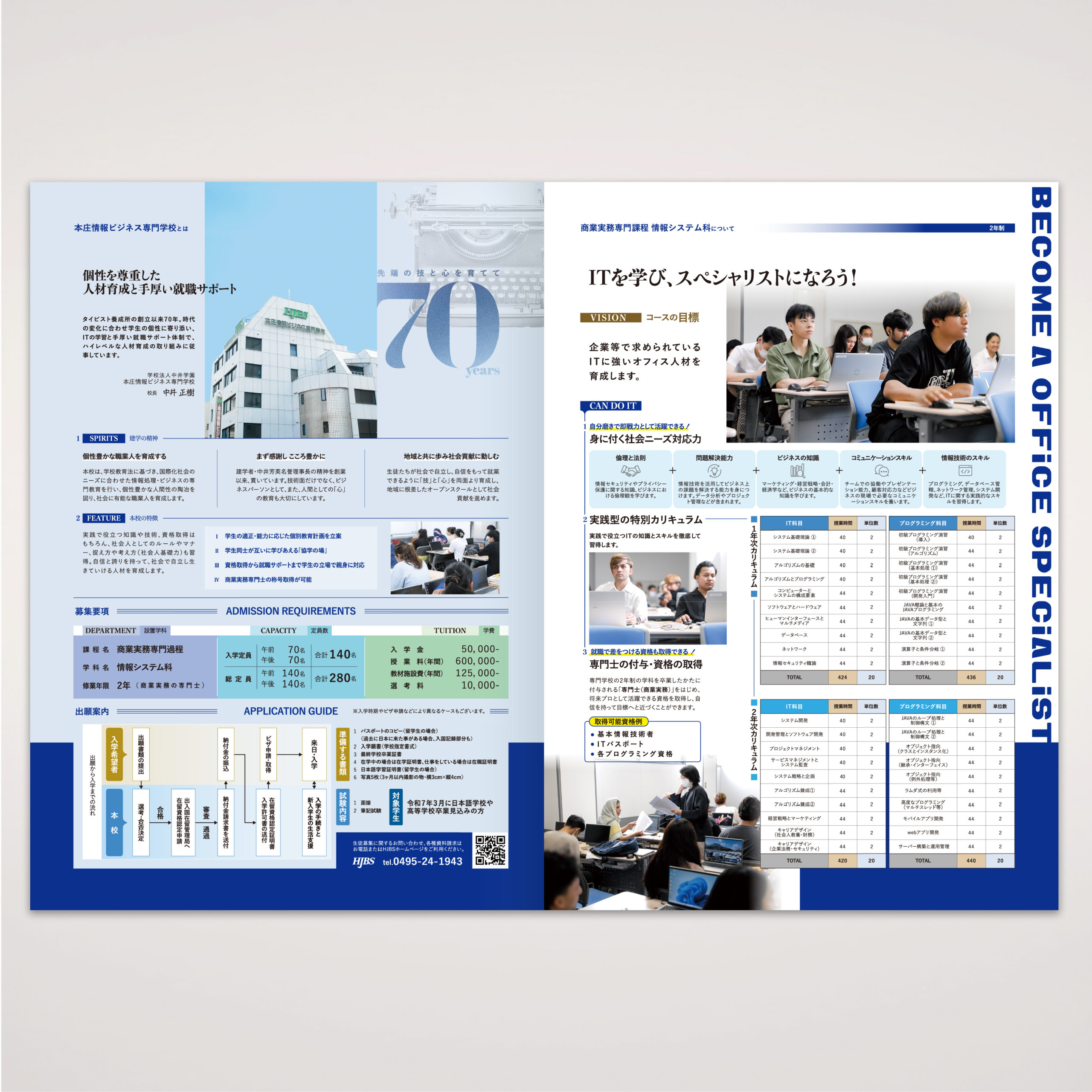IT人財を育成する専門学校 vol.2 Client : HJBS 本庄情報ビジネス専門学校 Field : ガイドブック(A4/4頁) https://hjbs.ac.jp 埼玉県本庄駅前にある、IT人材を育成する情報ビジネス専門学校です。タイピスト育成所創立から七十周年を迎える歴史を重んじながら、新たな学習形態となった学校です。将来、日本のIT社会の一端を担う、外国人就労者の育成を目的として教育しておられます。膨大な情報量になりやすいガイドブックですが、要点を絞り込み、読み手の負担にならない分量でわかりやすく簡潔にまとめました。