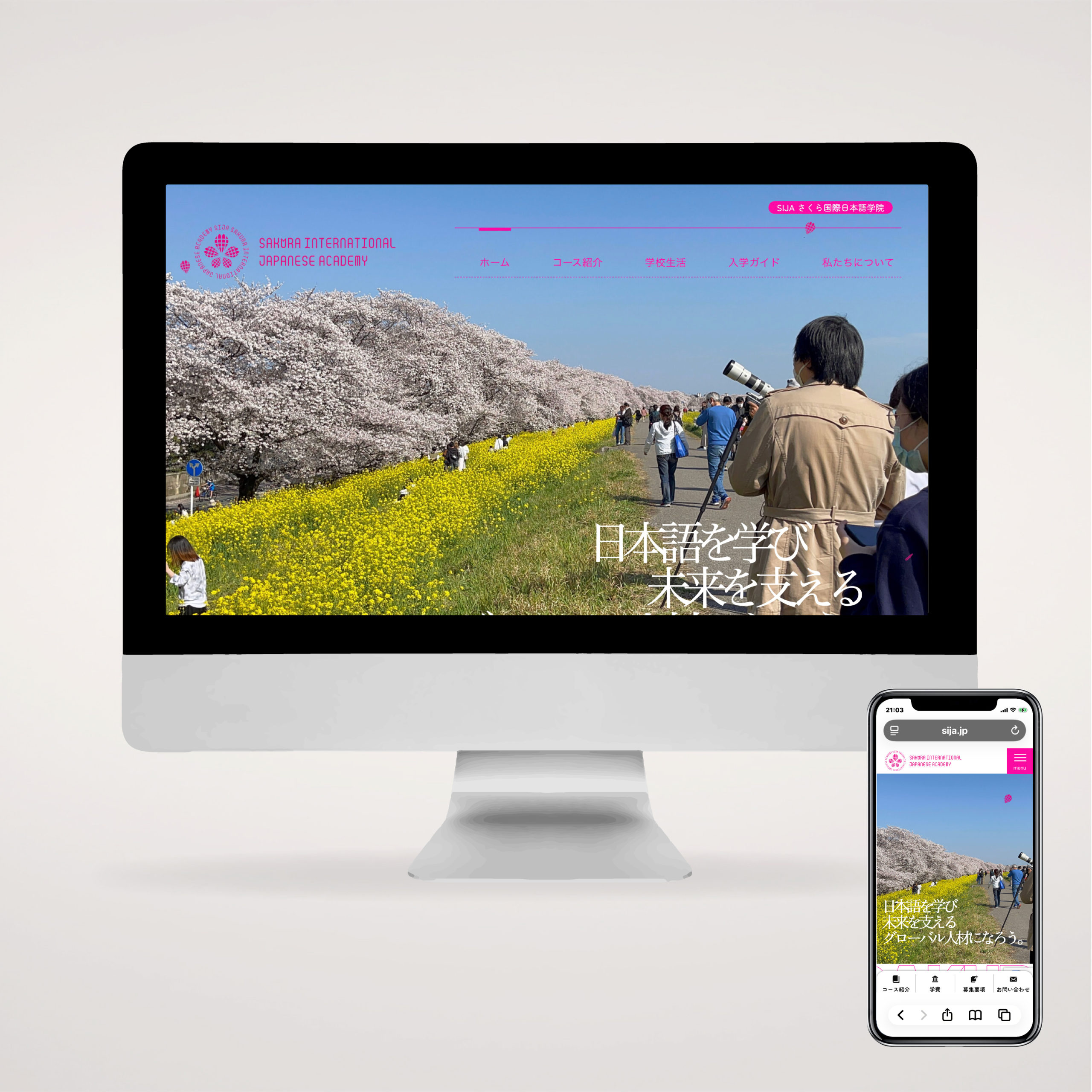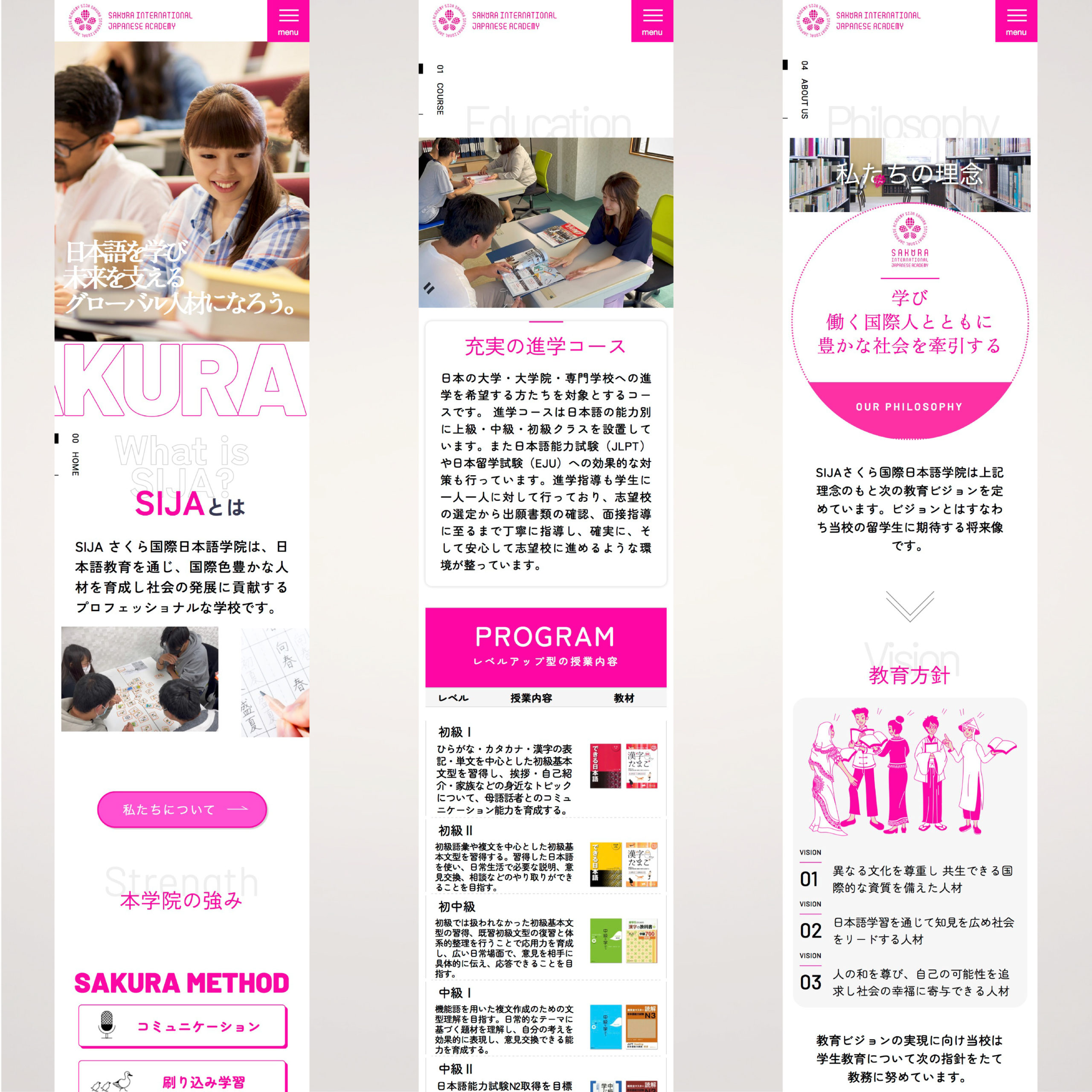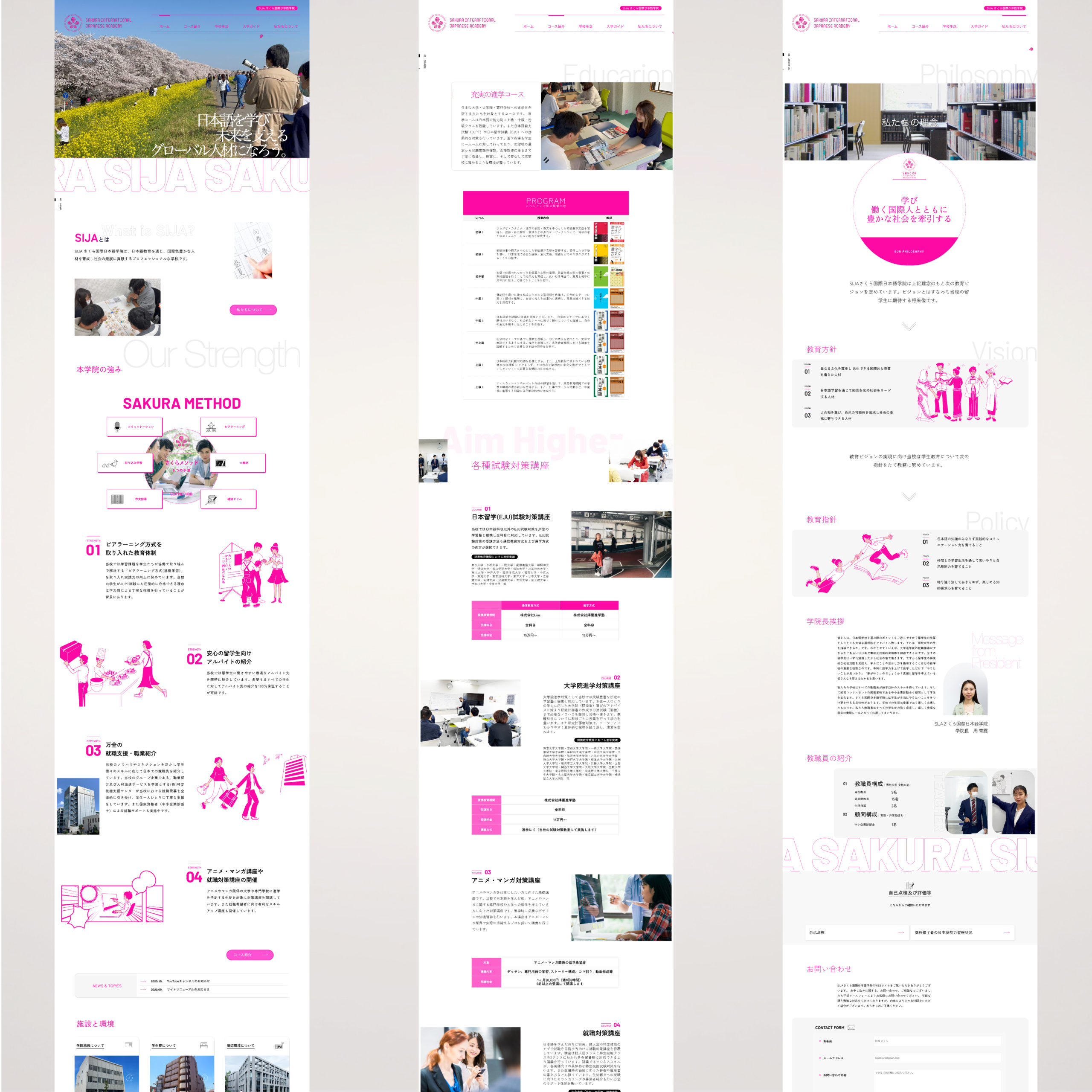 熊谷市にある日本語学校 vol.2 Client : SIJA さくら国際日本語学院 Field : ウェブサイト) https://sija.jp 埼玉県熊谷市にある、外国人留学生を教育する日本語学校です。国際色豊かな日本語学校のウェブサイトをイラストを交え、コーポレートカラーのマゼンダカラーで統一し制作しました。