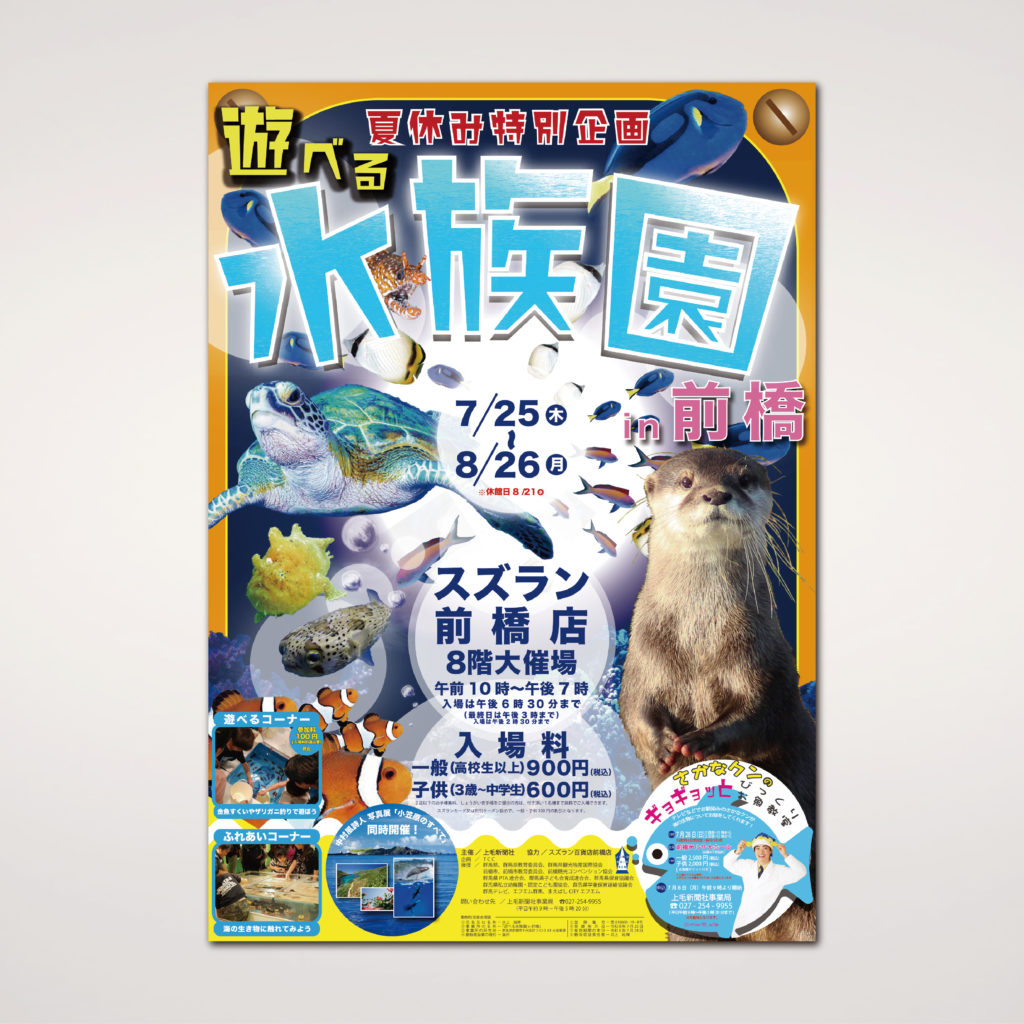 Client : 上毛新聞社・TCC Field : 新聞広告・ポスター・リーフ・チケット 群馬県の地元紙、上毛新聞社主催の夏の特別企画、遊べる水族園の広告ツー…